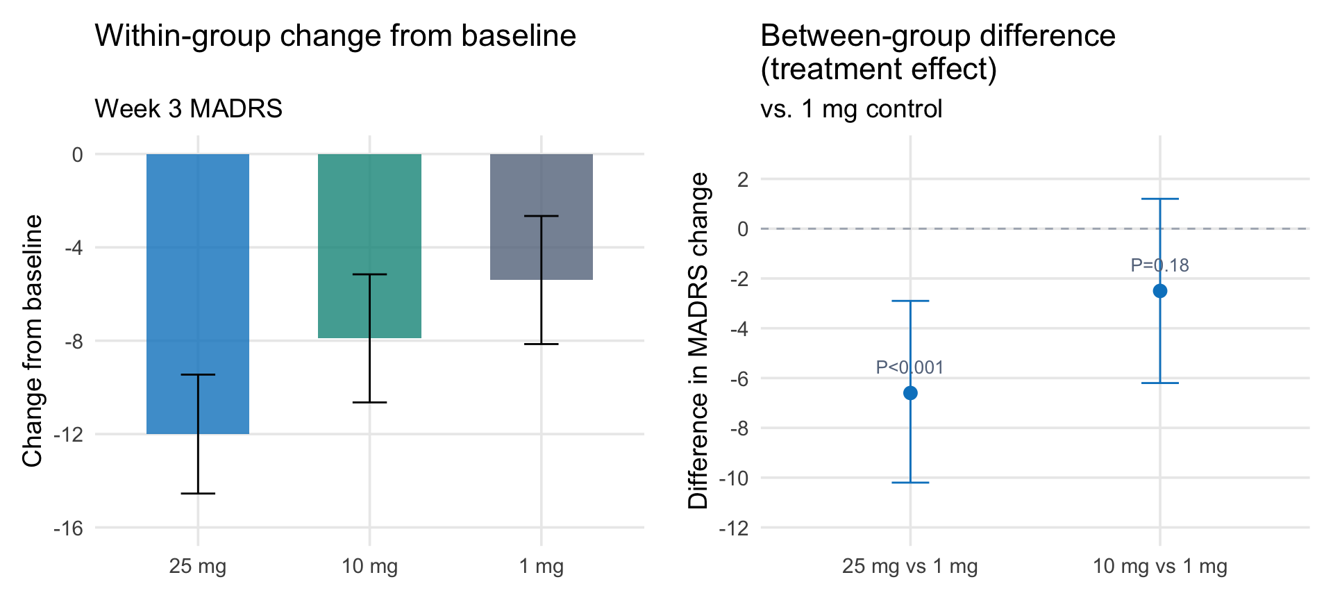 Two ways to present the same Phase 2b data. Left: within-group change from baseline, which includes regression to the mean, passage of time, and the therapeutic setting. Right: the between-group difference, which estimates the treatment effect. Data from Goodwin et al. (2022).