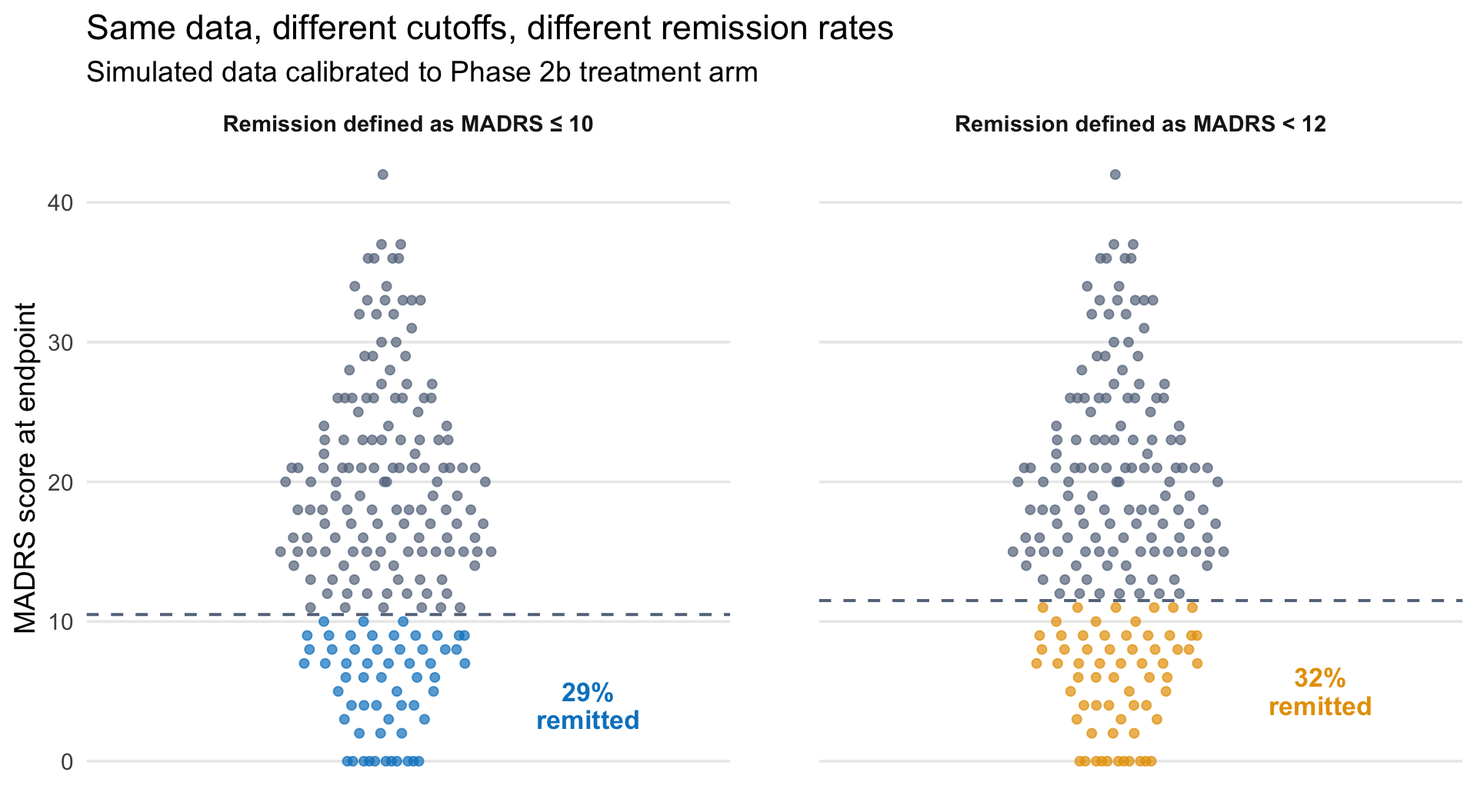 library(ggbeeswarm)set.seed(43)# Calibrated to reproduce ~29% remission at MADRS ≤ 10# consistent with Phase 2b 25 mg arm (Goodwin et al., 2022)endpoint_scores <-pmax(0, round(rnorm(200, mean =15.5, sd =10)))rate_10 <-mean(endpoint_scores <=10)rate_12 <-mean(endpoint_scores <12)panel_df <-bind_rows(tibble(score = endpoint_scores,panel ="Remission defined as MADRS \u2264 10",color_group =ifelse(score <=10, "remitted_10", "not_remitted")),tibble(score = endpoint_scores,panel ="Remission defined as MADRS < 12",color_group =ifelse(score <12, "remitted_12", "not_remitted"))) |>mutate(panel =factor(panel, levels =c("Remission defined as MADRS \u2264 10","Remission defined as MADRS < 12")))labels_df <-tibble(panel =factor(levels(panel_df$panel), levels =levels(panel_df$panel)),threshold =c(10.5, 11.5),rate_label =c(paste0(round(rate_10 *100), "%\nremitted"),paste0(round(rate_12 *100), "%\nremitted")),label_y =c(4, 5),label_color =c(ghr_blue, ghr_orange))ggplot(panel_df, aes(x =1, y = score, color = color_group)) +geom_quasirandom(size =1.8, alpha =0.7, width =0.25) +geom_hline(data = labels_df, aes(yintercept = threshold),linetype ="dashed", linewidth =0.7, color = ghr_slate) +geom_text(data = labels_df,aes(x =1.45, y = label_y, label = rate_label, color =NULL),color = labels_df$label_color,size =4.5, fontface ="bold", lineheight =0.9,inherit.aes =FALSE) +scale_color_manual(values =c("remitted_10"= ghr_blue, "remitted_12"= ghr_orange,"not_remitted"= ghr_slate),guide ="none" ) +scale_x_continuous(limits =c(0.4, 1.7)) +scale_y_continuous(breaks =seq(0, 50, 10)) +facet_wrap(~ panel) +labs(title ="Same data, different cutoffs, different remission rates",subtitle ="Simulated data calibrated to Phase 2b treatment arm",x =NULL, y ="MADRS score at endpoint") +theme(panel.grid.minor =element_blank(),panel.grid.major.x =element_blank(),axis.text.x =element_blank(),axis.ticks.x =element_blank(),strip.text =element_text(size =11, face ="bold"),panel.spacing.x =unit(3, "lines"))