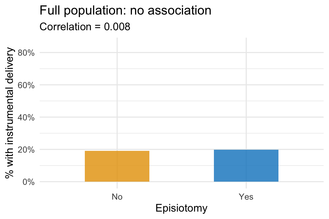 In the full population, the rate of instrumental delivery is the same regardless of whether a woman had an episiotomy—exactly what we’d expect from two independent variables: