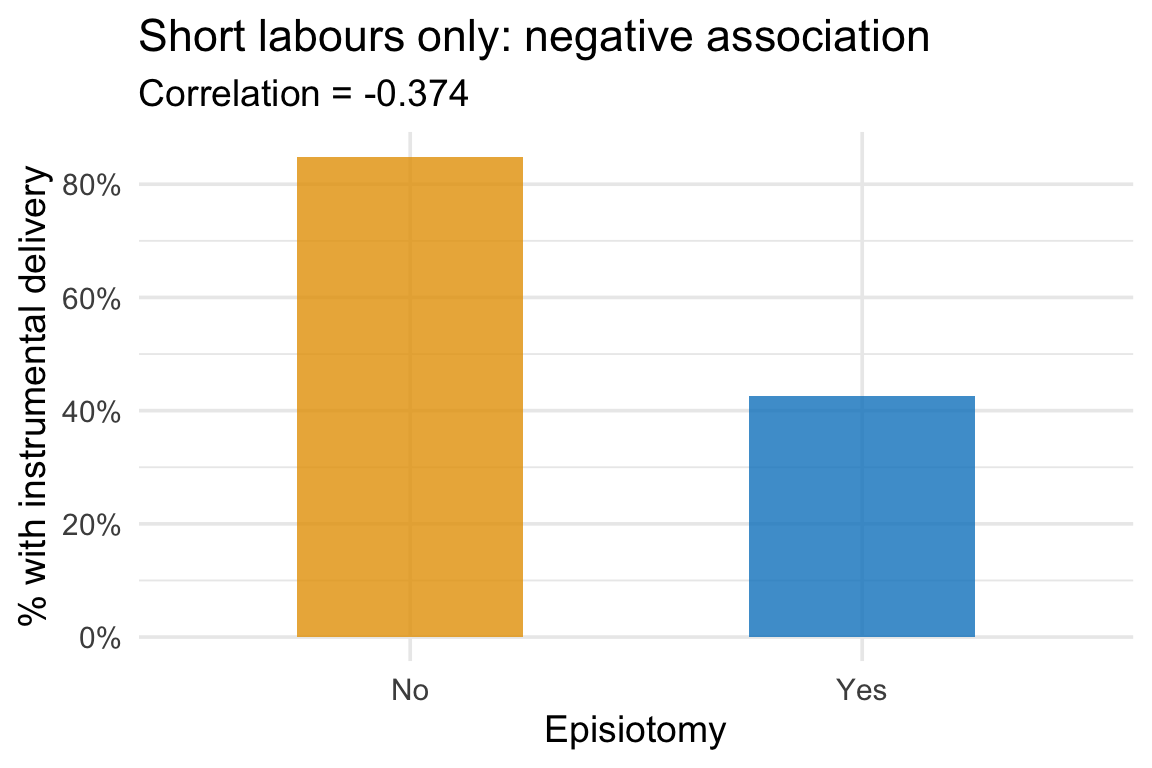 Among women with short labours, those who did not have an episiotomy were more likely to have had an instrumental delivery. Conditioning on the shared effect created an association between its causes that did not exist in the full population.