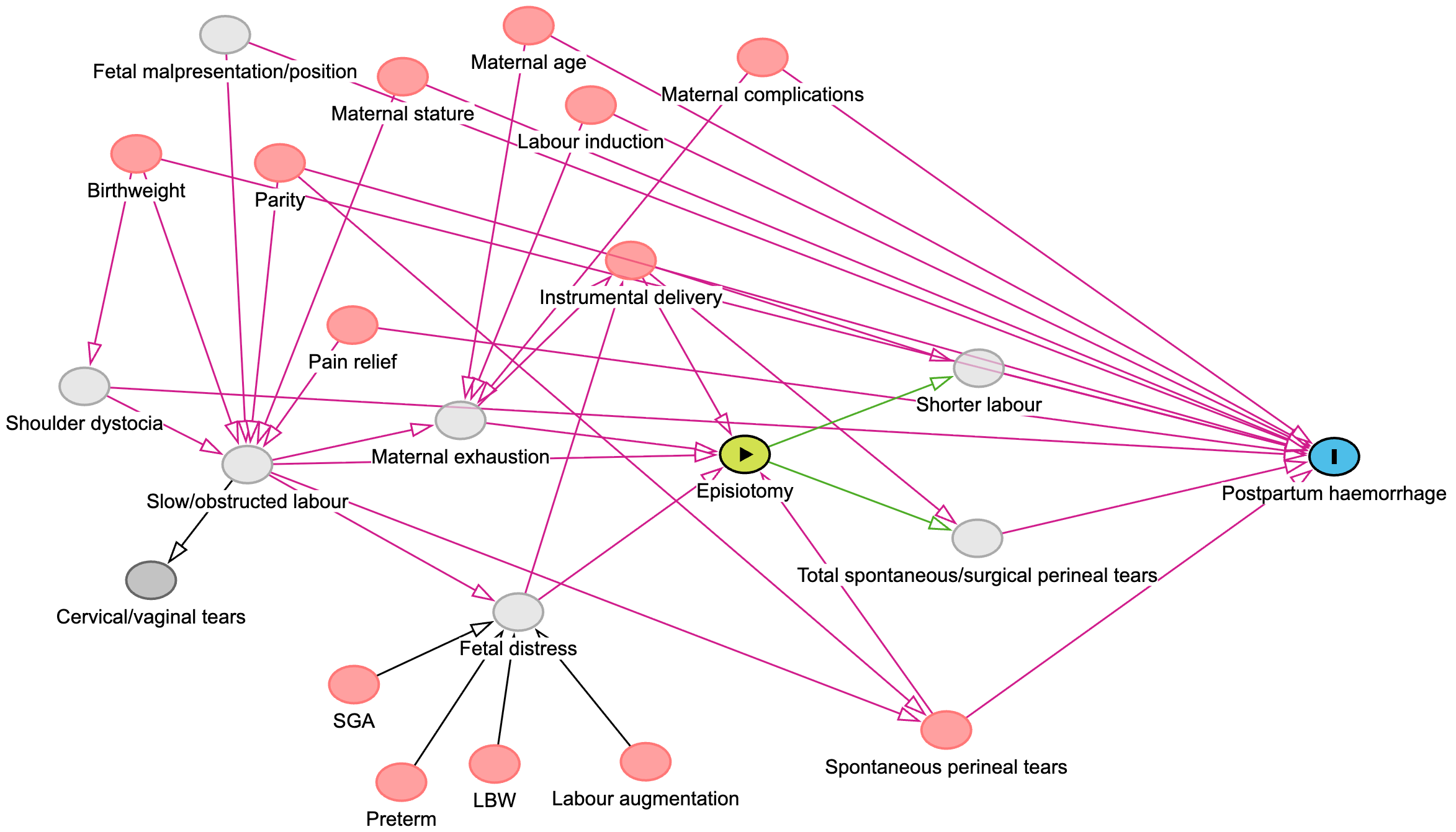 Slow/obstructed labour → Episiotomy, Slow/obstructed labour → Spontaneous perineal tears → Postpartum haemorrhage