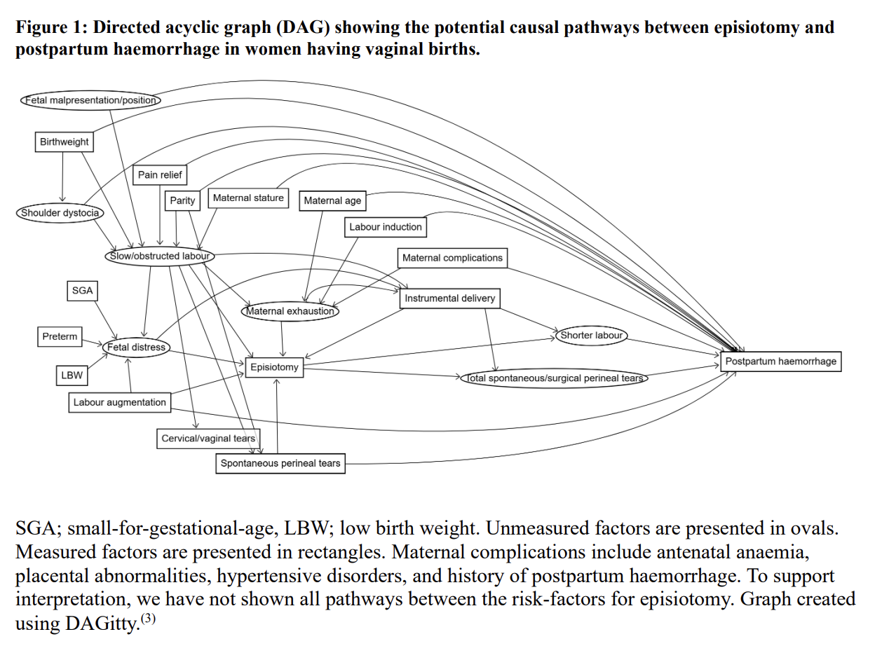 Figure 1: DAG showing the potential causal pathways between episiotomy and postpartum haemorrhage in women having vaginal births. Unmeasured factors are presented in ovals; measured factors in rectangles. Source: Woodd et al. (2026), The Lancet Global Health, Appendix 6.