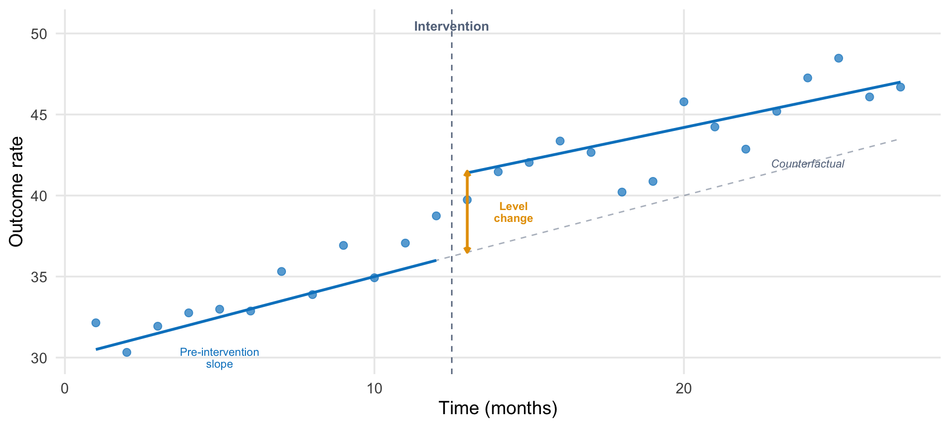 # Create a clean pedagogical ITS diagramn_pre <-12n_post <-15intervention <- n_pre +1time <-1:(n_pre + n_post)pre <- time <= n_prepost <- time > n_pre# Parameters (simplified for pedagogy)intercept <-30pre_slope <-0.5level_change <-5post_slope_change <--0.1# True trendy_trend <-ifelse(pre, intercept + pre_slope * time, intercept + pre_slope * time + level_change + post_slope_change * (time - n_pre))# Counterfactualy_counterfactual <- intercept + pre_slope * time# Add noiseset.seed(42)y_obs <- y_trend +rnorm(length(time), 0, 1.2)df_its <-tibble(time = time,observed = y_obs,trend = y_trend,counterfactual = y_counterfactual,period =ifelse(pre, "Pre", "Post"))ggplot(df_its) +# Intervention linegeom_vline(xintercept = n_pre +0.5, linetype ="dashed",color = ghr_slate, linewidth =0.5) +# Counterfactualgeom_line(aes(x = time, y = counterfactual),linetype ="dashed", color = ghr_slate, alpha =0.5) +# Observed pointsgeom_point(aes(x = time, y = observed, color = period), size =2.5, alpha =0.7) +# Trend lines (pre and post separately)geom_line(data =filter(df_its, period =="Pre"),aes(x = time, y = trend), color = ghr_blue, linewidth =1) +geom_line(data =filter(df_its, period =="Post"),aes(x = time, y = trend), color = ghr_blue, linewidth =1) +# Annotationsannotate("text", x = n_pre +0.5, y =max(y_obs) +2,label ="Intervention", size =3.5, color = ghr_slate, fontface ="bold") +annotate("segment",x = n_pre +1, xend = n_pre +1,y = intercept + pre_slope * (n_pre +1),yend = intercept + pre_slope * (n_pre +1) + level_change,color = ghr_orange, linewidth =1,arrow =arrow(length =unit(0.15, "cm"), ends ="both")) +annotate("text", x = n_pre +2.5,y = intercept + pre_slope * (n_pre +1) + level_change /2,label ="Level\nchange", size =3, color = ghr_orange,lineheight =0.9, fontface ="bold") +annotate("text", x =5, y = intercept + pre_slope *5-2.5,label ="Pre-intervention\nslope", size =3, color = ghr_blue,lineheight =0.9) +annotate("text", x = n_pre + n_post -3,y = y_counterfactual[length(y_counterfactual)] -1.5,label ="Counterfactual", size =3, color = ghr_slate,fontface ="italic") +scale_color_manual(values =c("Pre"= ghr_blue, "Post"= ghr_blue),guide ="none") +labs(x ="Time (months)", y ="Outcome rate") +theme(panel.grid.minor =element_blank())