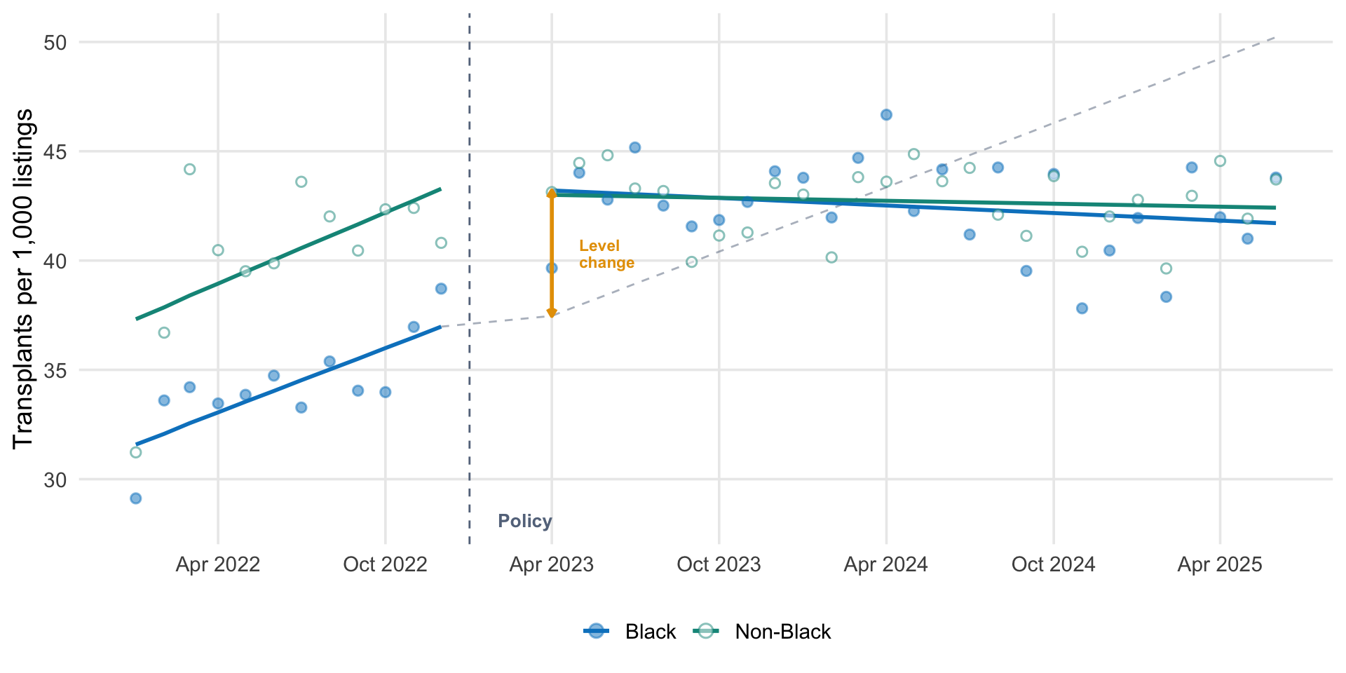 # Generate predictionsits_data <- its_data |>mutate(fitted =if_else( race_group =="Black",predict(fit_black, newdata =pick(everything())),predict(fit_nonblack, newdata =pick(everything())) ) )# Counterfactual: extend pre-intervention trend into post period# Create a separate data frame that spans from last pre month through all post monthsblack_pre_last <- its_data |>filter(race_group =="Black", post ==0) |>slice_max(time)black_post <- its_data |>filter(race_group =="Black", post ==1)# Build counterfactual line from last pre-intervention month through endcf_times <-c(black_pre_last$time, black_post$time)cf_months <-c(black_pre_last$month, black_post$month)cf_values <-coef(fit_black)["(Intercept)"] +coef(fit_black)["time"] * cf_timescf_line <-tibble(month = cf_months, counterfactual = cf_values)# Also compute counterfactual at all time points for the level change annotationits_data <- its_data |>mutate(counterfactual =if_else( race_group =="Black",coef(fit_black)["(Intercept)"] +coef(fit_black)["time"] * time,NA_real_ ) )# Compute level change for annotationblack_post_start <- black_post |>slice_min(month)black_cf_at_post <-coef(fit_black)["(Intercept)"] +coef(fit_black)["time"] * black_post_start$timeblack_fitted_at_post <-predict(fit_black, newdata = black_post_start)effect_y_top <- black_fitted_at_posteffect_y_bot <- black_cf_at_posteffect_x <- black_post_start$monthggplot(its_data, aes(x = month, color = race_group, fill = race_group)) +# Counterfactual for Black: from last pre-intervention month through postgeom_line(data = cf_line, aes(x = month, y = counterfactual),linetype ="dashed", color = ghr_slate, alpha =0.5,inherit.aes =FALSE) +# Fitted lines (pre and post separately)geom_line(data =filter(its_data, post ==0),aes(y = fitted), linewidth =1) +geom_line(data =filter(its_data, post ==1),aes(y = fitted), linewidth =1) +# Observed datageom_point(aes(y = rate), size =2, alpha =0.5, shape =21, stroke =0.8) +# Policy linegeom_vline(xintercept =as.Date("2023-01-01"), linetype ="dashed",color = ghr_slate, linewidth =0.5) +# Level change annotationannotate("segment",x = effect_x, xend = effect_x,y = effect_y_bot, yend = effect_y_top,color = ghr_orange, linewidth =1,arrow =arrow(length =unit(0.15, "cm"), ends ="both")) +annotate("text", x = effect_x +30,y = (effect_y_bot + effect_y_top) /2,label ="Level\nchange", size =3, color = ghr_orange,fontface ="bold", lineheight =0.9, hjust =0) +annotate("text", x =as.Date("2023-02-01"),y =min(its_data$rate) -1,label ="Policy", size =3.5, color = ghr_slate,fontface ="bold", hjust =0) +scale_color_manual(values =c("Black"= ghr_blue,"Non-Black"= ghr_teal),guide =guide_legend(override.aes =list(shape =21, size =3,fill =c(ghr_blue, "white")))) +scale_fill_manual(values =c("Black"= ghr_blue,"Non-Black"="white"), guide ="none") +scale_x_date(date_breaks ="6 months", date_labels ="%b %Y") +labs(x =NULL, y ="Transplants per 1,000 listings",color =NULL) +theme(legend.position ="bottom",panel.grid.minor =element_blank())