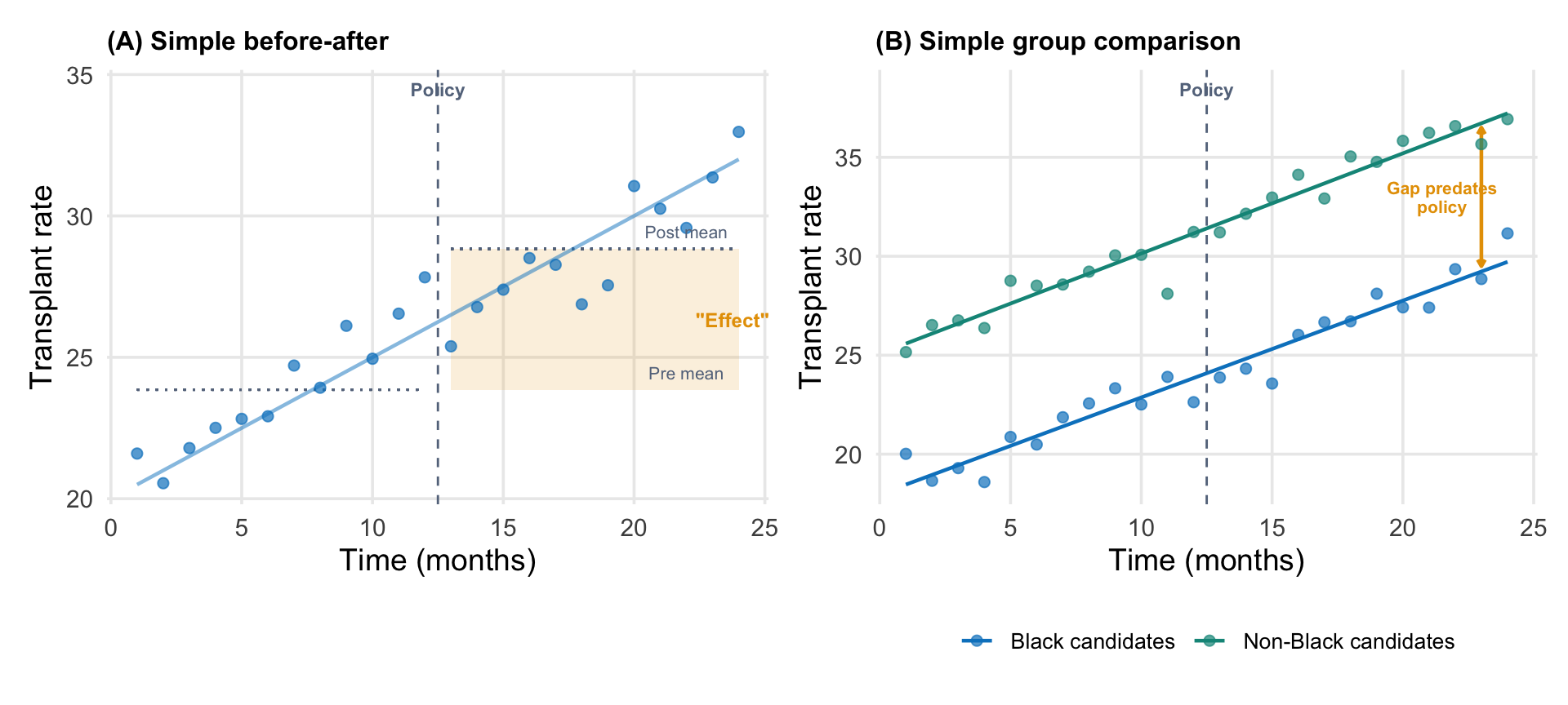 Why naive approaches mislead (illustrative data). (A) A simple before-after comparison attributes the pre-existing upward trend to the policy. The shaded region shows the apparent effect, but most of it is just the trend continuing. (B) A simple group comparison shows a gap between Black and non-Black candidates, but that gap existed before the policy. Without modeling trends, you cannot tell whether the policy changed anything.