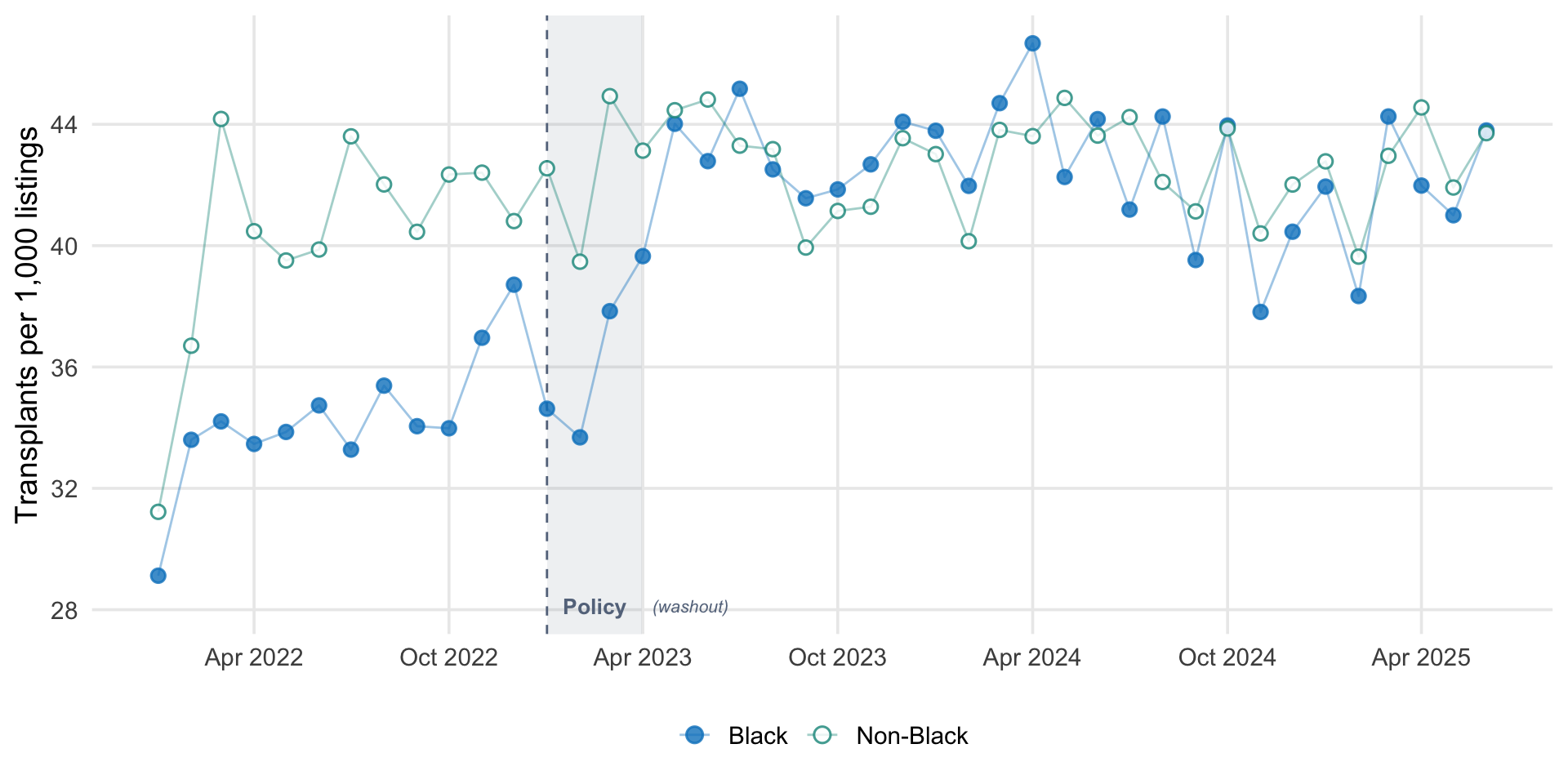 For each month from January 2022 through June 2025, I computed the number of kidney transplants and the number of actively waitlisted candidates, separately for Black and non-Black candidates. The transplant rate is expressed as transplants per 1,000 active listings per month.
